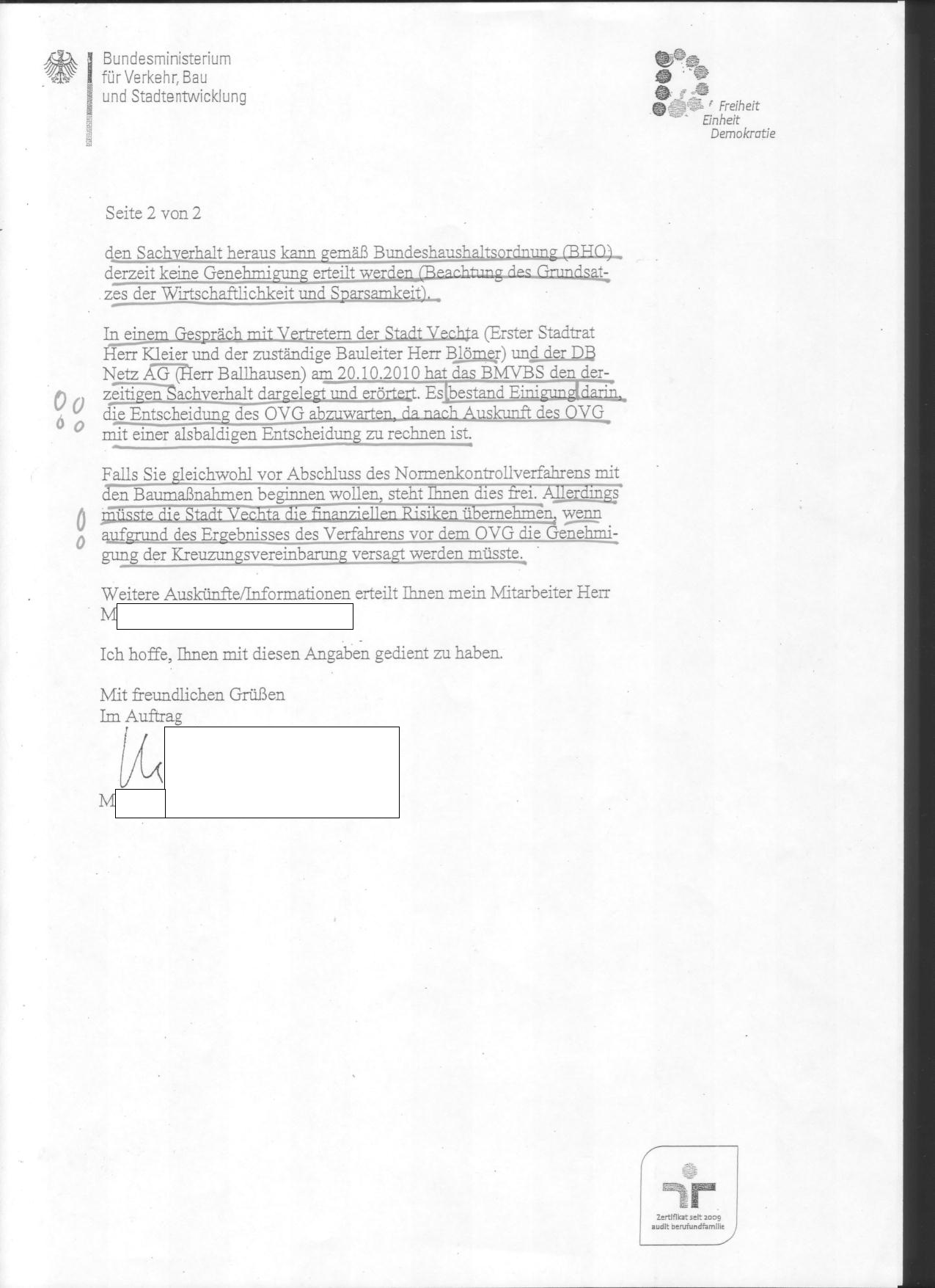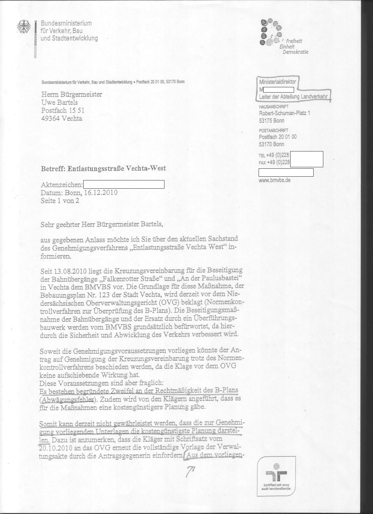 Um dem in der Podiumsdiskussion bei Sextro in Vechta durch Herrn Dalinghaus vorgebrachten Vorwurf der Lüge entgegenzutreten, veröffentlichen wir nun auf unserer Internetseite den dort zitierten Brief aus dem Bundesverkehrsministerium an Bürgermeister Bartels. Aus diesem Schreiben geht hervor, dass ein Weiterbau der Entlastungsstraße derzeit auf eigenes Risiko der Stadt Vechta erfolgen muss. Die vom Bürgermeister immer wieder beteuerte Finanzierungszusage aus dem Bundesministerium ist bis zum heutigen Tage nicht erfolgt und wird verschoben, bis das OVG über das anhängige Normenkontrollverfahren entschieden hat.