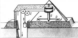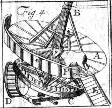 Mit so einem Göpel könnte man durch geschickte Übertragung der Bewegungskraft des Rindes die Fahrstuhlkabine sowohl nach oben als auch nach unten bewegen. Man müsste nur ab und zu das Rind umdrehen.
