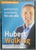Hubertus, der Wolkinger mit einer hübschen Corona. Und nicht nur das: Wenn man sich die Farbgestaltung des Plakates einmal anschaut, erinnert das doch sehr an die Farben, mit der die CDU in der Regel ihre Plakate gestaltet: Blau, Orange und Weiß.